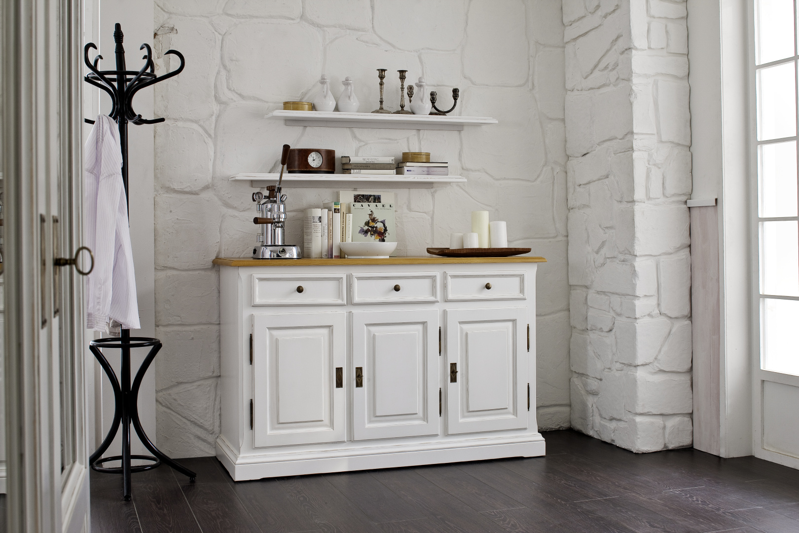 Anrichte ANNA 3-trg. in Fichte massiv Anrichte RU-007 mit 2 Wandborde RU-904 in Fichte Antik Weiß. Oben 3 Schubladen, Unten 3 Türen mit Fachböden. 5. Februar 2026 Wohnen Ähnliche Projekte Schlafzimmer ANNA in Fichte massiv Esszimmer ANNA in Eiche massiv Beistellschrank ANNA in Fichte massiv Esstisch FLORENTINA in Eiche massiv