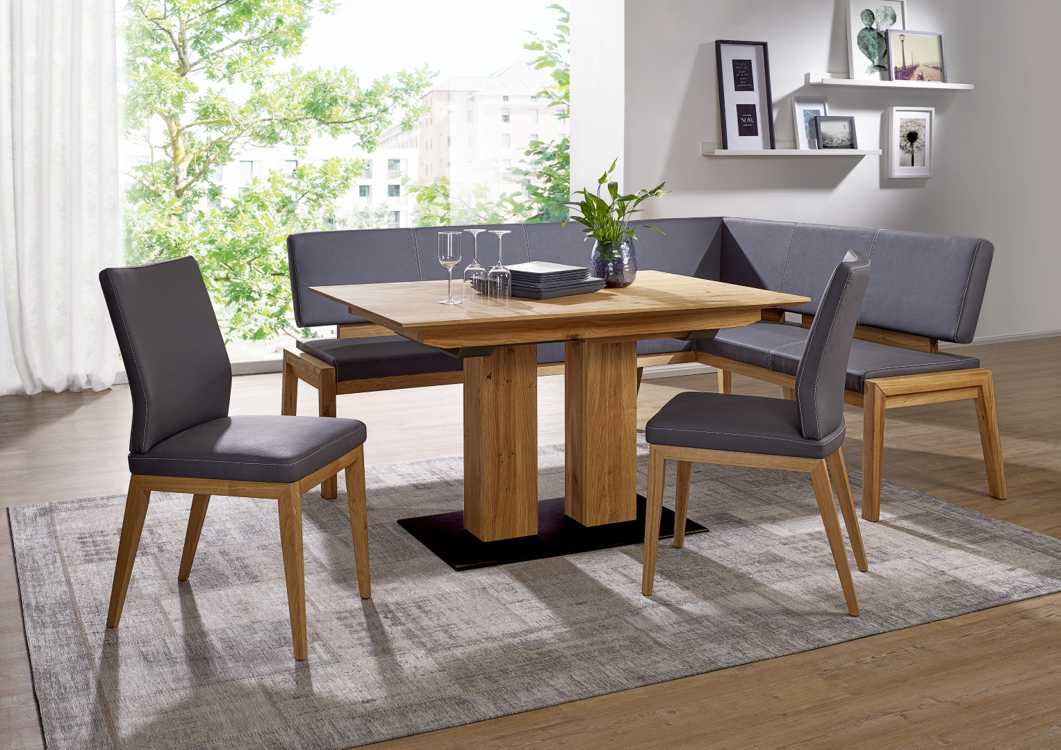 Eckbankgruppe MELANIE in Eiche massiv Bankgruppe in Eiche massiv, Oberfläche Natur geölt bestehend aus Zweisäulen-Tisch Melanie, Eckbank Lea und Stühle Laura. Bank und Stühle gepolstert. 5. Februar 2026 Wohnen Ähnliche Projekte Schlafzimmer ANNA in Fichte massiv Esszimmer ANNA in Eiche massiv Beistellschrank ANNA in Fichte massiv Esstisch FLORENTINA in Eiche massiv