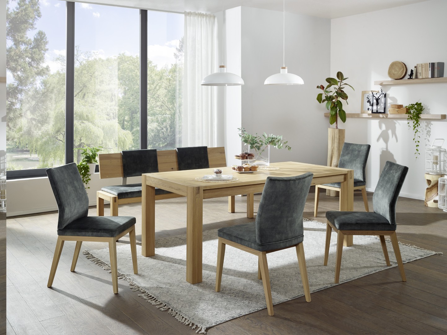 Tischgruppe in Wildeiche Natur geölt bestehend aus Tisch Beatrice 180 x 90 cm TBE-1890 – Bank Beatrice 180 x 40 cm BBE-1840 mit Stoffpolster – Stühle Laura mit Stoffpolster – Eine Stoffauswahl ist aus unserer vielfältigen Stoffkollektion möglich!