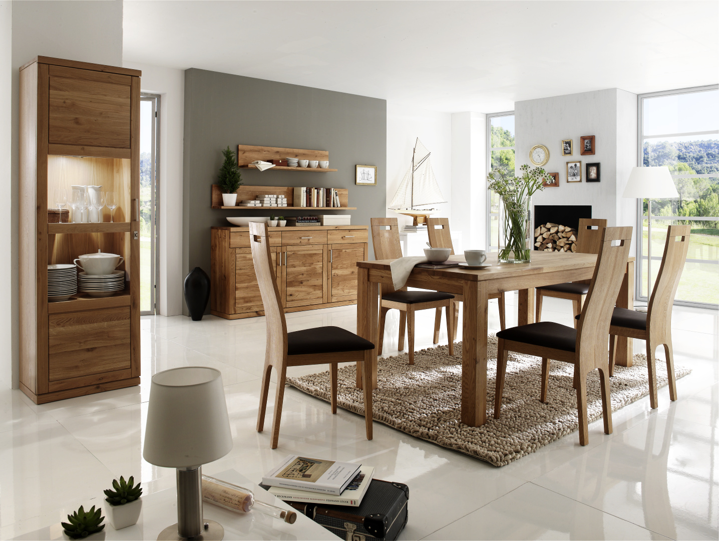 Wohnzimmermöbel in Wildeiche bestehend aus Vitrine 1-trg. BI-014 mit BE-160 (Aufpreis) – Anrichte 3-trg. BI-007 – Wandbord 120/18 cm BI-002 – Tisch Lisa LI-180 – Stühle BI-735L-Large gepolstert, Leder braun.