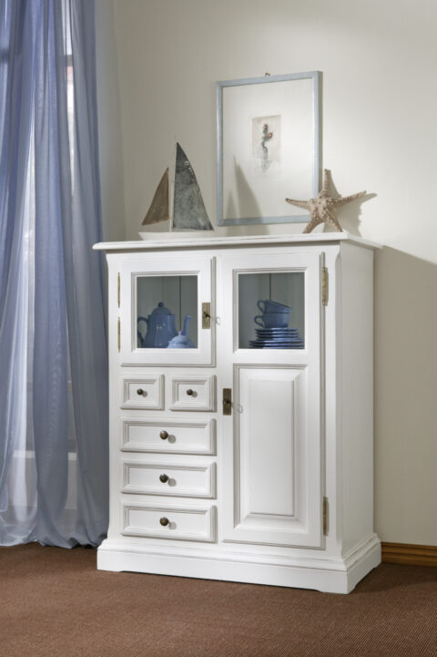 Beistellschrank RU-352 in Fichte massiv, Oberfläche Antik Weiß. Alle Oberflächen aus unserer Musterkollektion sind möglich.
