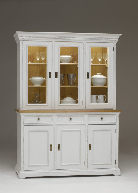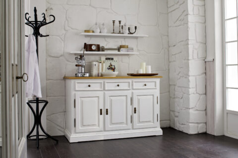 Anrichte RU-007 mit 2 Wandborde RU-904 in Fichte Antik Weiß. Oben 3 Schubladen, Unten 3 Türen mit Fachböden.