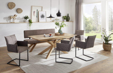 Tischgruppe in Eiche Natur geölt bestehend aus Tisch und Einzelbank Modell Franca mit Freischwinger-Stühle Modell Paula.
