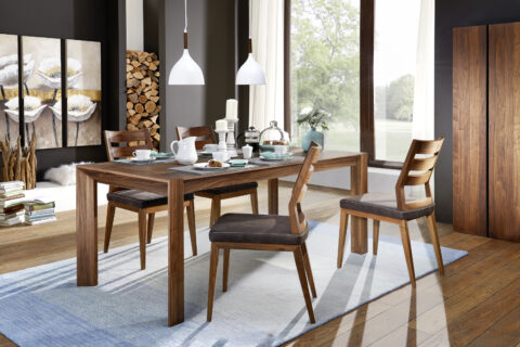 Essgruppe in Nußbaum Natur geölt bestehend aus Tisch Modell Marie und Stühle Modell Alina, Stuhlsitze gepolstert.