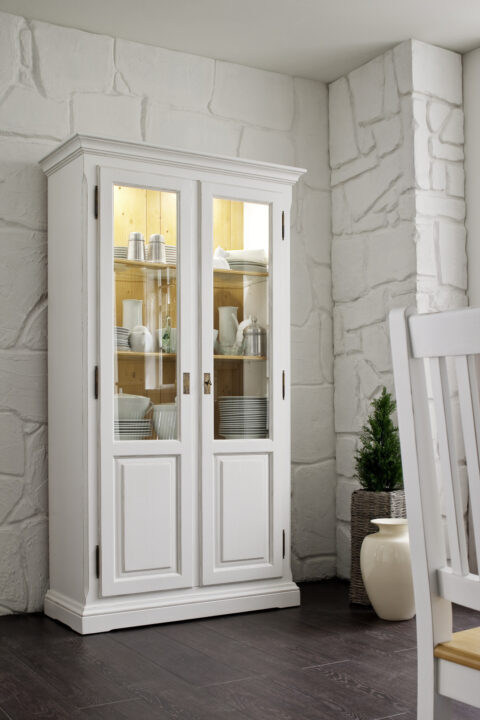 Glasvitrine Modell Anna RU-038A 2-trg. in Fichte massiv, Oberfläche Antik Weiß.