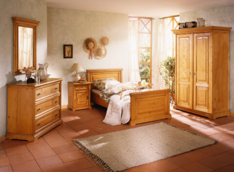 Schlafzimmer in Fichte massiv, Oberfläche Antik gewachst bestehend aus Kommode AD-113 – Spiegel AD-055 – Nachtkästchen AD-112E – Einzelbett...