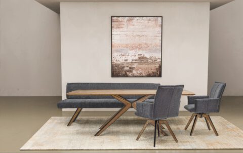 Einzelbank mit Lehne und Esstisch Modell Ester, Stühle Modell Alina.