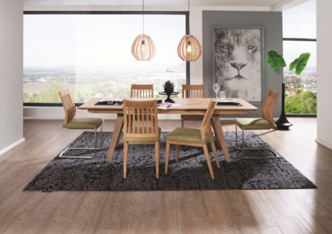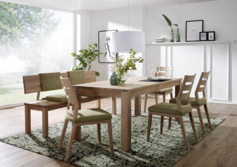 Esstischgruppe in Eiche massiv, Oberfläche Natur geölt bestehend aus Tisch Samira, mit Stühlen Emma und Freischwinger-Stühle Melanie. Stuhlsitze gepolstert.
