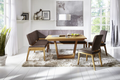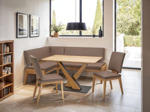 Eckbankgruppe in Eiche massiv, Oberfläche geölt. Gepolsterte Bank und Stühle Modell Laura, Tischmodell Lena.