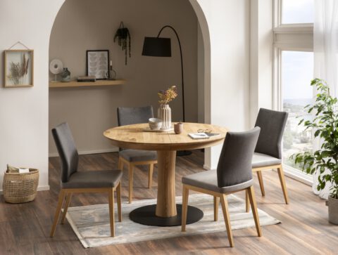 Eleganter Säulentisch JANINA mit ausziehbarer Platte zu einer ovalen Form. Bodenplatte aus Metall für eine stabile Standfestigkeit. Stühle Modell...