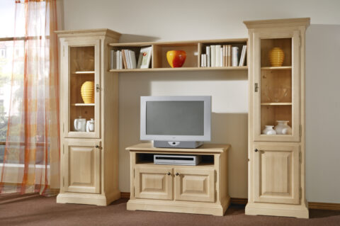 Wohnwand 4-tlg. in Fichte massiv, Oberfläche Ro 138 gewachst bestehend aus Vitrine RU-358L – TV-Anrichte RU-376 – Wandbord RU-905...