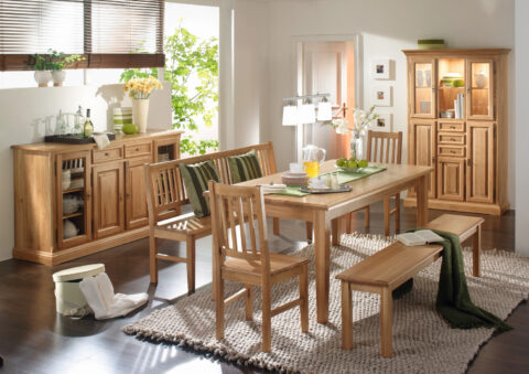 Esszimmer Victoria in Fichte massiv, Oberfläche Fichte gewachst bestehend aus Sideboard AD-006 – Beistellbank AD-040 – Tisch AD-035 –...